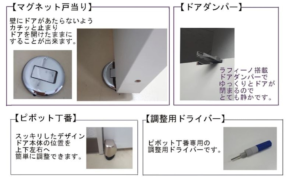 経年変化に拠るドア本体のズレを、付属のドライバーとピボット丁番で簡単に調整することが出来ます。